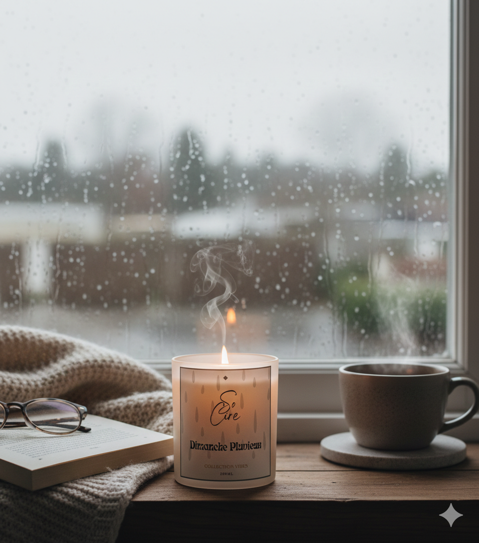Dimanche Pluvieux capture l'ambiance cosy d'un thé chaud près de la fenêtre un jour de pluie.